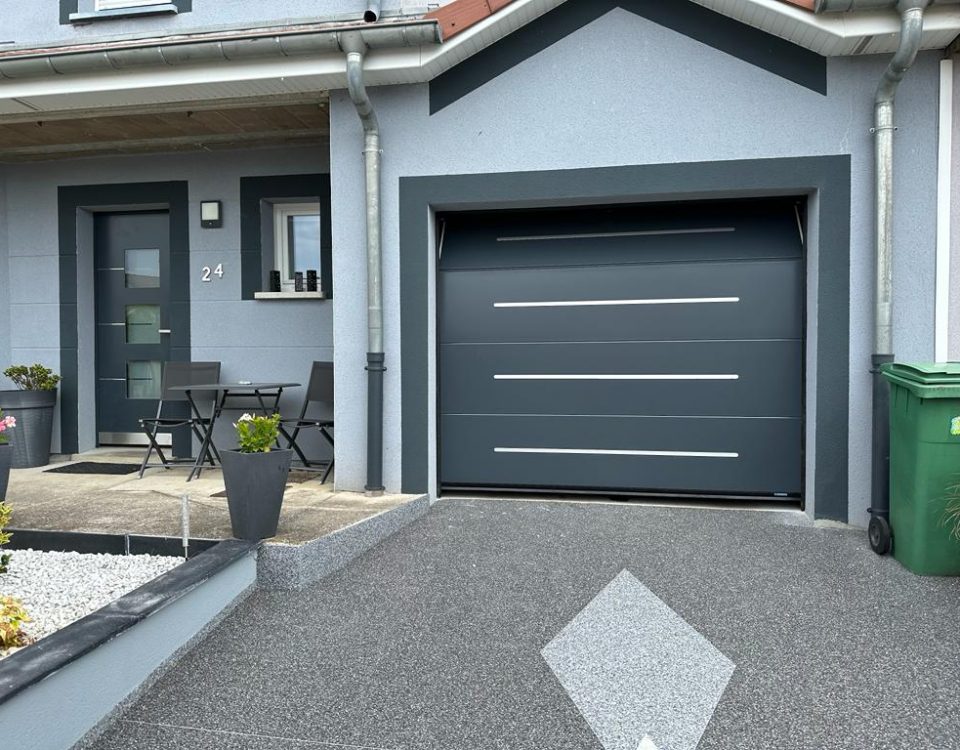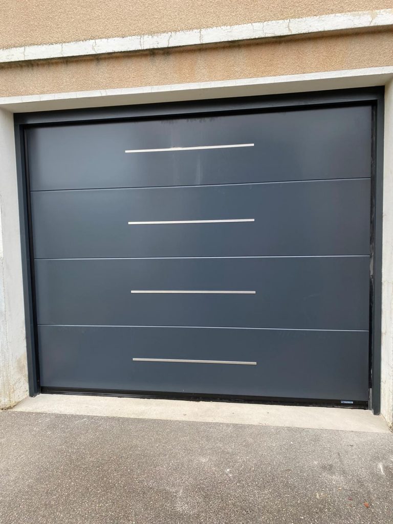 Porte de garage sectionnelle en aluminium laquée gris anthracite+ Epaisseur 42 mm isolante +Manœuvre motorisée+ Design lisse+ Motifs horizontaux+ Porte d’entrée en aluminium laquée gris anthracite+ […]