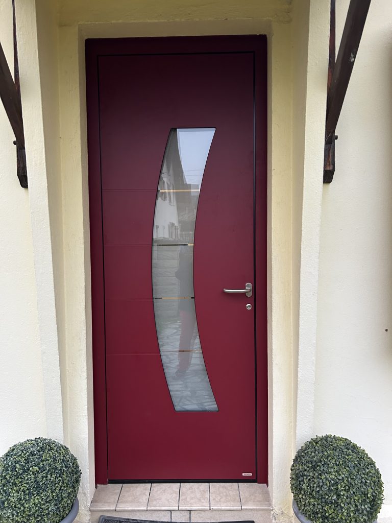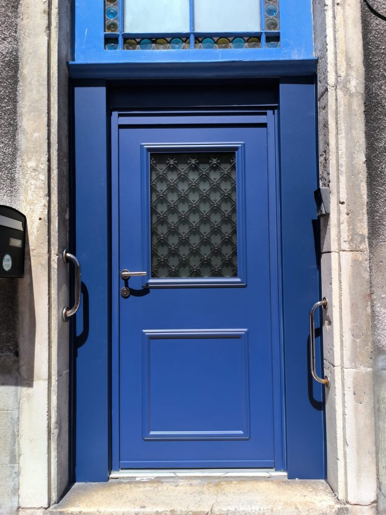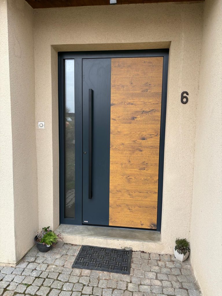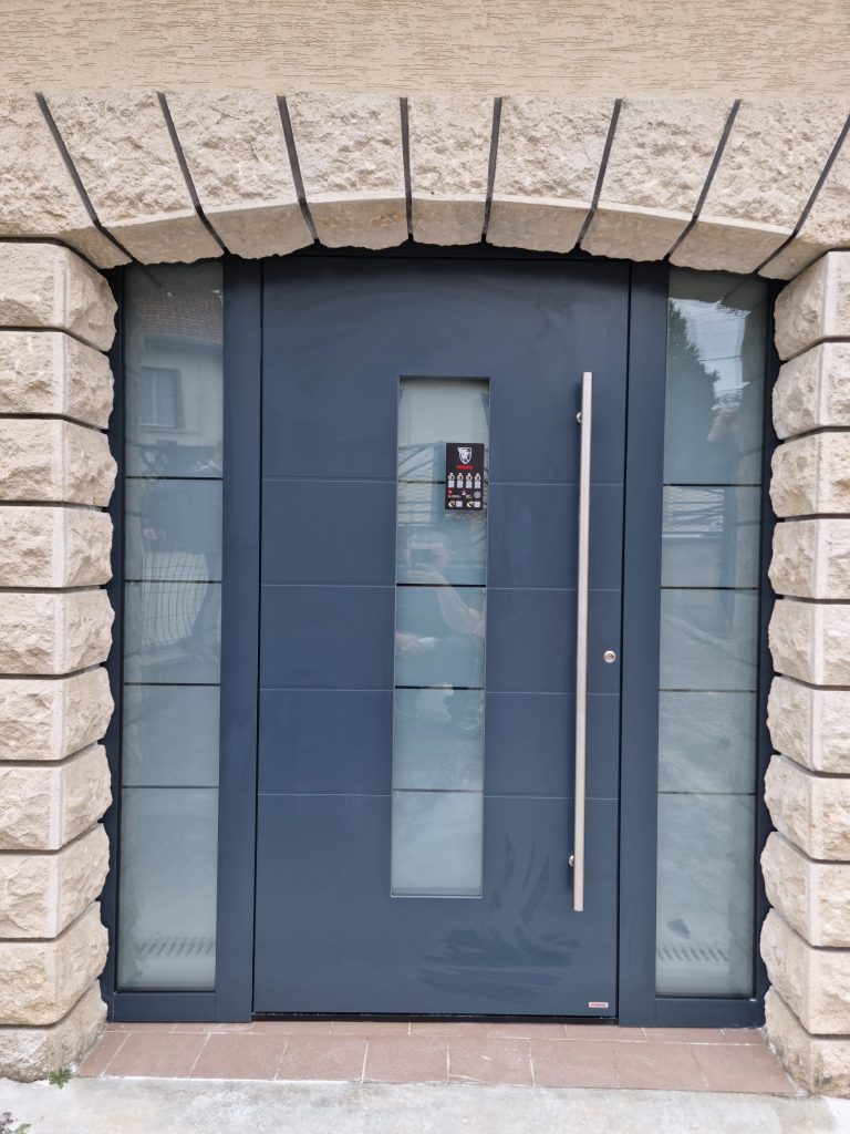 Porte d’entrée aluminium laquée Gris anthracite extérieur+ Motifs géométriques blanc+ Serrure 5 points Barillet de sécurité+ Isolation thermique + Hublots et imposte fixe latéral vitrage securit […]
