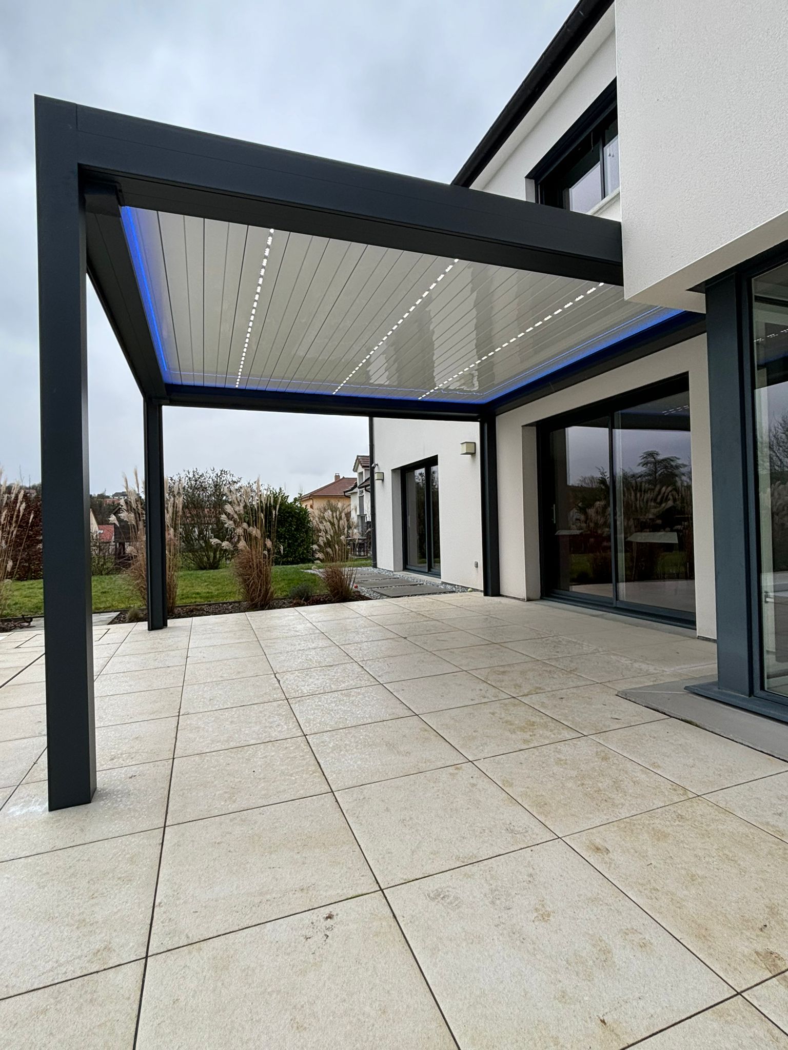 Pergola bioclimatique avec ossature en aluminium laquée gris anthracite. + Lames orientables et rétractables en aluminium laquées blanc avec LEDS intégrées + Bandeau LED RGB en périphérie.
