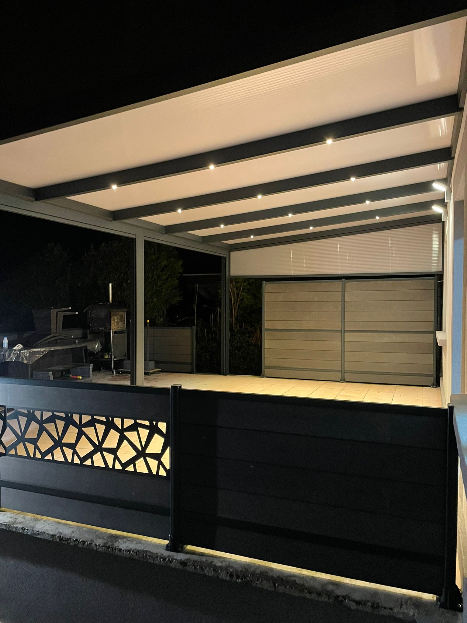 Pergola Fixe avec ossature en aluminium laquée gris anthracite + Toiture fixe Panneau sandwich+ Eclairage spots LED intégré dans les Chevrons