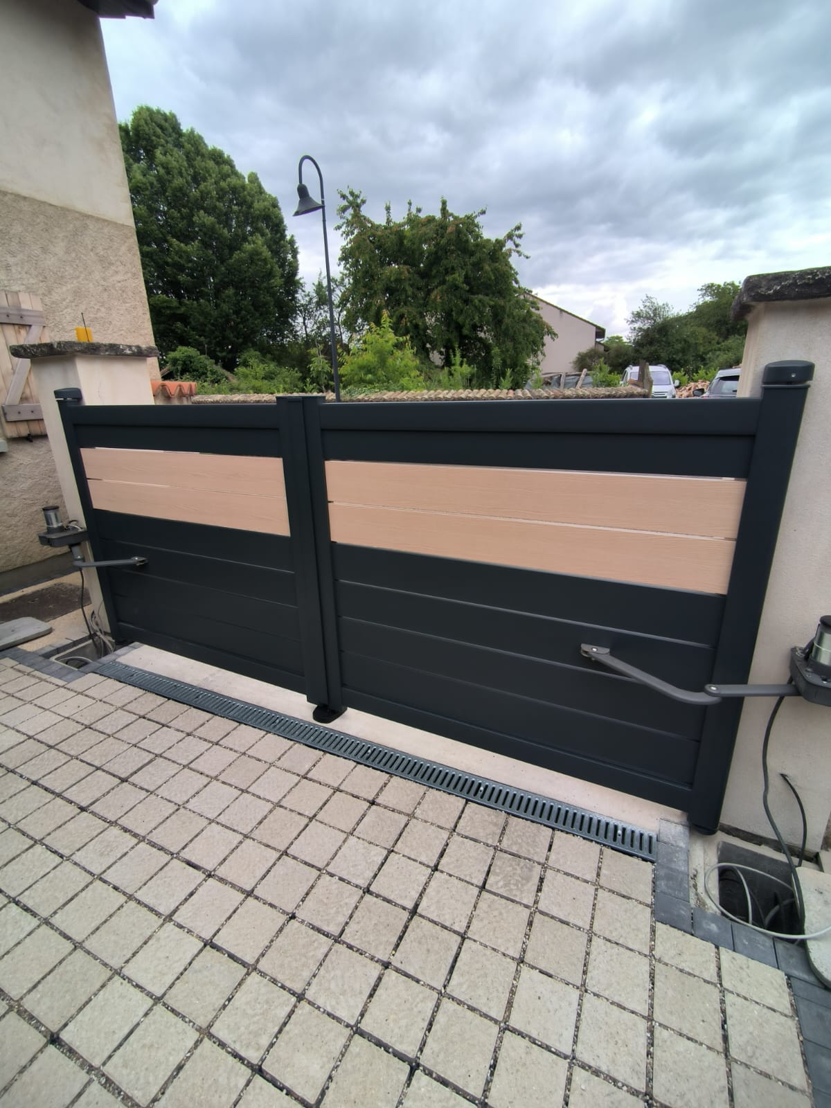 Portail en aluminium laqué gris anthracite et ivoire+ Battant 2 vantaux + Lames ajourées et lames plaines.